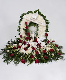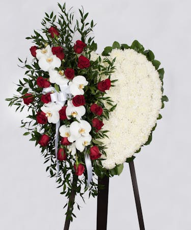 This spectacular standing heart shaped wreath with added orchids and roses spray is a stunning display of love and devotion. A beautiful floral heart is created with dozens of white commercial mums, and is outlined with salal leaves. Attached to this heart is a breathtaking spray of red roses and enchanting white phalaenopsis orchids. The spray is designed with lush greens and is accented with a trailing ribbon. Ital Florist has been trusted since 1976 in Toronto and across the GTA with creating and delivering the finest sympathy and funeral flowers in Canada. This gift is a part of a very special set of matching funeral arrangements that we call "Always Loved".