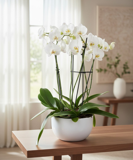Enchanting white blossoms ebb and flow in an artful cascading display. Featuring three stems of long-flowering phalaenopsis orchids presented in a cream bowl.
