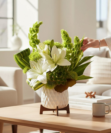 Send them a gift of pure style! Presented in a mid-century ceramic planter with unique geometric motif, this artistic lily arrangement is one they'll never forget. A stunning gift from any angle! Add style to their day with this artistic lily arrangement, presented in a chic mid-century ceramic planter with sleek wood base.