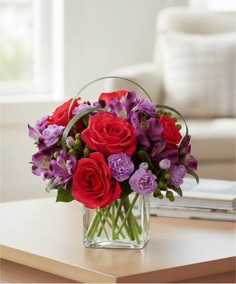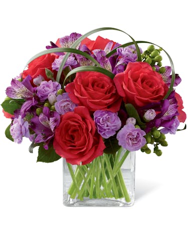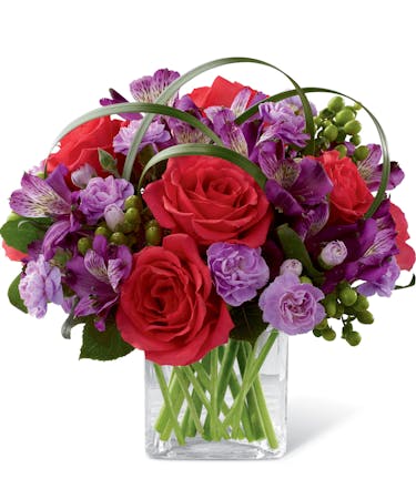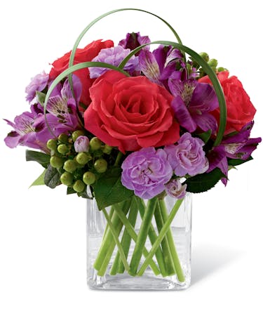 Blooming with bright and bold colours, this exquisite flower bouquet is set to celebrate. Hot pink roses, purple alstroemeria, lavender mini carnations and green hypericum berries are brought together to create a popular flower arrangement. Flowers are arranged in a clear glass cube vase with lily grass blades and lush greens. This value-priced mixed flower bouquet will make a wonderful gift for any occasion.