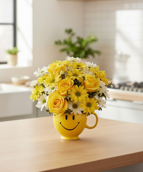 This happy bouquet has been a top seller for years. And for Classic reason... because it brings smiles to people. It's upbeat. The ceramic reusable coffee mug is clearly cheerful and the flowers inside are bright and uplifting. This bouquet includes yellow roses, yellow and white daisy spray mums and delicate oregonia greens. It's promptly delivered across Toronto and the GTA by Ital Florist's cheerful local drivers!