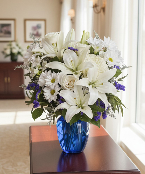 In this beautiful flower arrangement, the serenity of blue - along with the purity symbolized by white - will let the family know you are sending your sincere condolence and sympathy to them during a difficult time. Beautiful blooms such as cream roses, white lilies and alstroemeria along with yellow and white chrysanthemums, purple statice, lavender limonium, eucalyptus and lemon leaf are beautifully arranged in a dazzling cobalt blue vase.