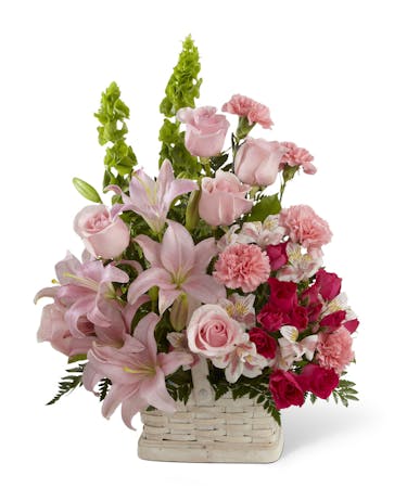 The Beautiful Spirit Arrangement is a light and lovely way to honour the life of the deceased. A blushing display of pink roses, Asiatic lilies and Peruvian lilies are highlighted by stems of fuchsia carnations and spray roses as well as Bells of Ireland and assorted lush greens. Seated in a white woodchip basket, this graceful arrangement creates an exceptional way to offer peace and sympathy.