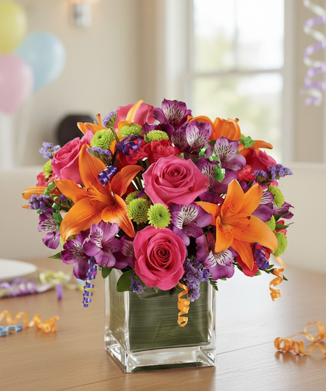 This vibrant and colourful flower bouquet is bright, happy, and ready to celebrate! Hot pink roses and orange lilies are fun and resplendent surrounded by purple alstroemeria, hot pink mini carnations, green button poms, purple statice, and assorted greens. Flowers are accented with assorted curling ribbons to give it a party vibe. This bouquet is hand delivered and presented in a clear glass cube vase lined with ti leaf green material and set to make it their best birthday yet!
