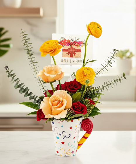 Celebrate their special day with our vibrant and joyful Birthday Celebration Bouquet. Designed in a festive keepsake mug, this arrangement features a beautiful mix of premium blooms including rich red roses, soft peach roses, and golden yellow ranunculus, accented with fresh greenery and eucalyptus.