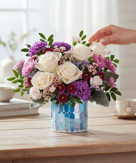 Springtime beauty at its best! Creamy roses and deep purple blooms are oh-so-alluring in this shimmering, stained glass mosaic vase. Crème roses, purple carnations, miniature light pink carnations, lavender cushion spray chrysanthemums, purple button spray chrysanthemums, pink waxflower and purple limonium are arranged with dusty miller and huckleberry.
