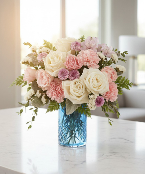 The Blue Belle Bouquet is a delicate arrangement of soft pink, white, and lavender blooms artfully designed in a textured blue glass vase. Featuring a beautiful blend of roses, spray roses, carnations, and alstroemeria, this bouquet is accented with lush greenery and subtle filler flowers for added texture and depth.