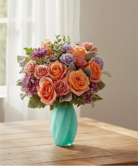 Vibrant and full of warmth, the Blue Radiance Bouquet showcases a lively blend of orange, pink, and lavender blooms designed to make a bold yet elegant statement. Light orange roses are paired with pink spray roses, lavender carnations, and rich purple chrysanthemums, accented with soft texture and fresh greenery. Arranged in a sculpted blue glass vase with a graceful diagonal swirl design, this eye-catching arrangement is perfect for birthdays, celebrations, thank-you gifts, or simply adding colour and energy to any space.
