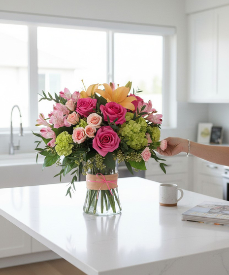 Go ahead, make them blush! This luxurious bouquet of roses, lilies and hydrangea in fresh shades of pink, peach and green is sure to put some cheerful colour in their cheeks! This sweet arrangement features green hydrangea, hot pink roses, pink spray roses, peach Asiatic lilies, pink alstroemeria, green carnations, pink miniature carnations and greenery like seeded eucalyptus, parvifolia eucalyptus and lemon leaf. Flowers are hand arranged in a glass gathering vase with delicate ribbon treatment.