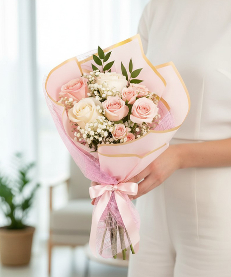 Soft, romantic, and effortlessly elegant, the Blush Pearl Hand-Tied Bouquet features a delicate blend of blush and ivory roses accented with blush spray roses, baby's breath, and fresh Italian ruscus. Wrapped in luxurious blush paper and shimmering pink mesh with a satin ribbon finish, this garden-inspired bouquet is designed in an organic, hand-crafted style that feels natural and refined. Perfect for sending a beautiful gesture of love.