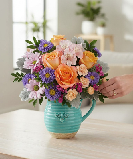 Talk about buzz-worthy! Presented in a country-inspired and fabulously food-safe ceramic pitcher with petite bee motif, this cheerful of lush orange roses and pretty pink blooms is two gifts in one! Featuring peach roses, light pink alstroemeria, peach miniature carnations, lavender matsumoto asters, lavender daisy spray chrysanthemums, and raspberry sinuata statice arranged with huckleberry and dusty miller in a Busy Bee Pitcher.