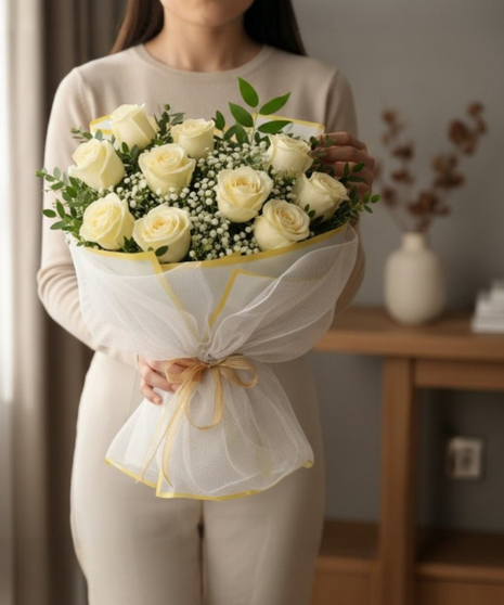 This hand-wrapped bouquet features 12 premium white Vendela roses, thoughtfully arranged with delicate baby's breath, lush parvifolia, and Italian ruscus. Finished in soft white wrapping with a natural, flowy presentation, this bouquet is perfect for celebrating life's meaningful moments - from birthdays and anniversaries to heartfelt everyday gestures.