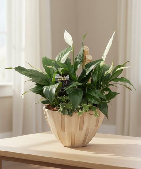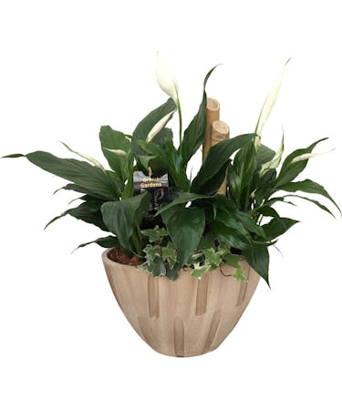 The Cream Sympathy Planter from Ital Florist in Toronto, ON, is a thoughtful and enduring way to express your condolences. This elegant arrangement features the serene beauty of peace lilies, complemented by a selection of lush tropical plants, all carefully placed in a sophisticated ceramic boat planter. The peace lilies, with their glossy green leaves and pristine white blooms, symbolize tranquility, purity, and hope for peace, making them ideal for conveying sympathy and support during difficult times.