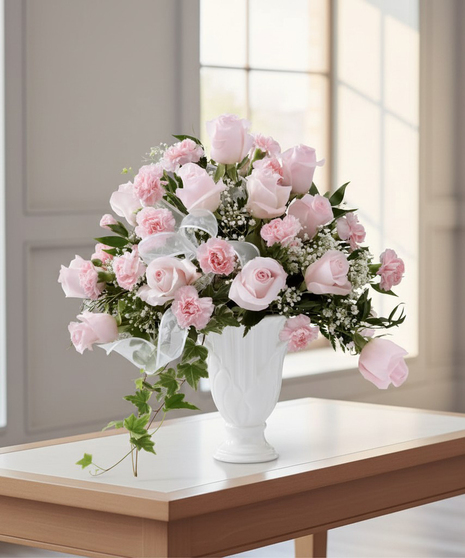 Our Deepest Sympathy Arrangement is a wondrous presentation of grace and elegance to honour the life of the deceased. Pale pink roses and pink carnations are offset by baby's breath, variegated ivy, lush greens, and a white sheer ribbon, gorgeously arranged in a designer white acrylic vase. This special gift is a lovely way to express your warmest sentiments, offering comfort and peace with each blushing bloom.