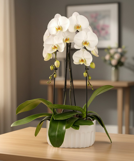 The Double Orchid Elegance showcases the natural beauty and sophistication of two pristine white phalaenopsis orchid stems, artistically arranged in a sleek white ceramic planter. This living display exudes grace and tranquility, making it a stunning addition to any setting.