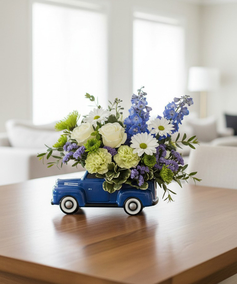 Bursting with a whimsical green, white and blue bouquet, this fun-filled ceramic Ford delivers smiles across the miles! This arrangement features white alstroemeria, red carnations, blue delphinium, white cushion spray chrysanthemums, blue sinuata statice, variegated pittosporum and parvifolia eucalyptus. This arrangement is delivered in a 1948 Ford Pickup Keepsake.