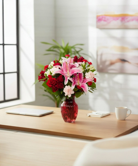 Remind her that your love is forever with this beautiful bouquet of red roses, red spray roses, white alstroemeria, peach carnations and stargazer lilies arranged and shown all around in a ruby red ribbed glass vase.