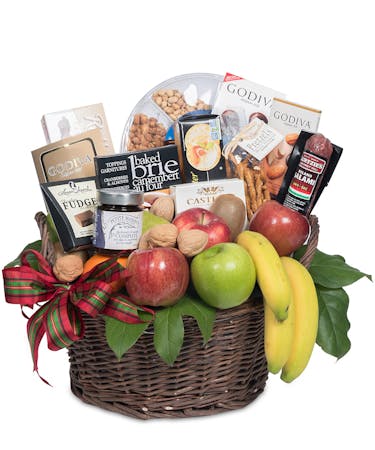 This mouth watering basket has a little bit of everything and is the perfect gift for sharing. A large natural wicker basket is filled to overflowing with a popular variety of fresh fruit like apples, oranges and bananas. A variety of wonderful gourmet treats are added - such as chocolates, cheese, crackers, compote, cookies, assorted nuts and much more. Green salal leaves and a plaid bow complete the look. Our Deluxe and Premium versions have even more delicious items!