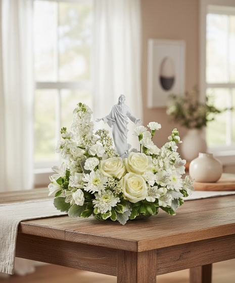 An elegant display of faith and grace, this beautiful arrangement will comfort the bereaved in a truly thoughtful and respectful way. An exquisite sculpture of Jesus is surrounded by a bed of lovely blossoms. It is sure to be appreciated and always remembered. A fragrant mix of pure white blooms - including roses, alstroemeria, stock, carnations and waxflower - is accented with dusty miller and variegated pittosporum. Delivered with an exclusive Sacred Grace keepsake.