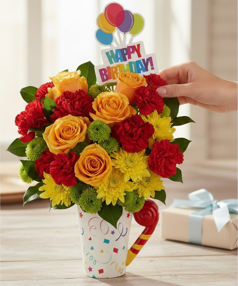 Send a floral celebration someone's way with this colourful bouquet, hand-delivered on a special day in a charmingly festive mug. Two gifts in one, they'll love the lush array of roses, carnations and mums just as much as the food-safe mug that's sure to be a favourite for morning coffee and afternoon tea! Light orange roses, red carnations, green button spray chrysanthemums and yellow cushion spray chrysanthemums are arranged with fresh lemon leaf. Delivered in a Cheers to You mug.