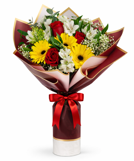 The Golden Joy Hand-Tied Bouquet is a vibrant, thoughtfully arranged mix of sunny yellow gerberas, classic red roses, crisp white alstroemeria, and dcelicate baby's breath, accented with airy solidago, eucalyptus, and Italian ruscus. Expertly hand-tied and wrapped in beautifull premium paper, this bouquet offers a fresh, modern presentation that highlights the natural movement and colour of each bloom for an effortlessly elegant finish.