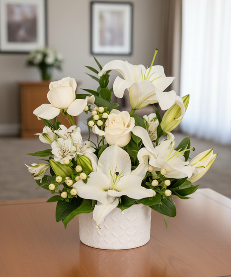 A serene and elegant tribute, Graceful Remembrance features pure white lilies, soft vendela roses, delicate white alstroemeria, and white hypericum berries arranged in a textured ceramic vase. This one-sided arrangement is a thoughtful expression of sympathy and comfort, ideal for sending to a funeral service or a grieving family's home.