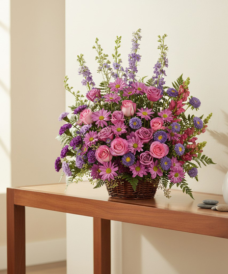 Sending this basket is a lovely way to share your thoughts and pay tribute to someone special. Soothing lavender, respectful purple and compassionate pinks are combined beautifully in this basket overflowing with pretty flowers, sincerity and sympathy. A profusion of purple, pink and lavender blooms such as roses, carnations, larkspur, matsumoto and monte casino asters and much more are delivered in a round wicker basket.