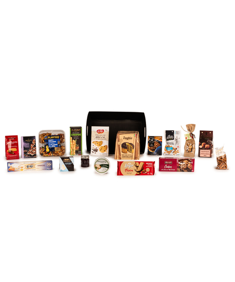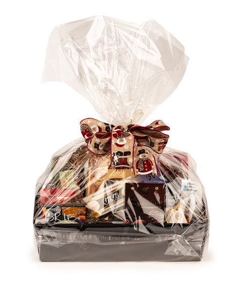 The Grand Indulgence Holiday Basket is the ultimate Christmas gift for families, clients, colleagues, and anyone deserving of an unforgettable holiday surprise. This is our largest and most impressive gourmet basket, overflowing with 18 premium items beautifully arranged in a sleek black presentation tray and wrapped with festive holiday cellophane and ribbon.