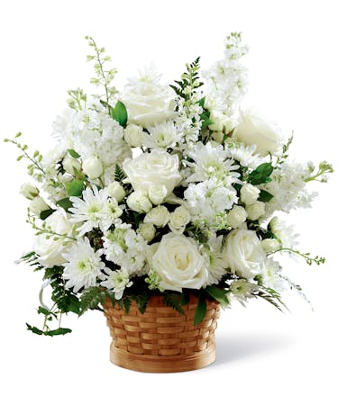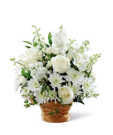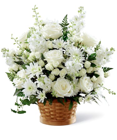 Let this exquisite composition of beautiful white blossoms deliver your sympathy and comfort to loved ones grieving a loss. The elegance of this arrangement and its warm, natural basket base makes it an appropriate addition to any service, or to send to the home of family or friends. This gift is handcrafted by Ital Florist in Toronto, or by an affiliated florist across Canada. It's made with carefully selected white roses, stock, cushion pompons and larkspur set among complementary greens for a memorable bouquet that evokes a tranquil sense of heavenly hope.