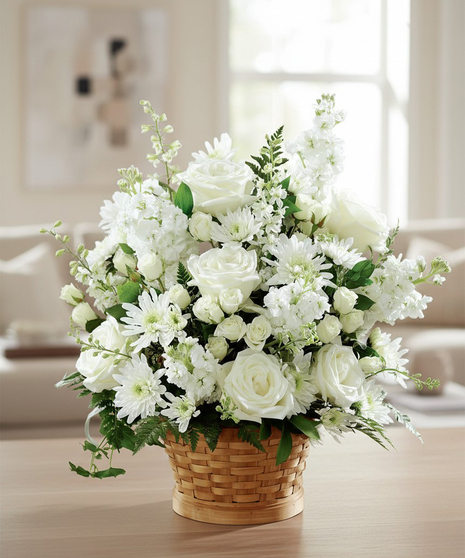Let this exquisite composition of beautiful white blossoms deliver your sympathy and comfort to loved ones grieving a loss. The elegance of this arrangement and its warm, natural basket base makes it an appropriate addition to any service, or to send to the home of family or friends. This gift is handcrafted by Ital Florist in Toronto, or by an affiliated florist across Canada. It's made with carefully selected white roses, stock, cushion pompons and larkspur set among complementary greens for a memorable bouquet that evokes a tranquil sense of heavenly hope.