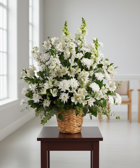 White alstroemeria, snapdragons and stock in a beautiful basket is a gift of caring that brings an air of serenity to the memorial service. Later, it will be a comfort for the family at home. This exquisite bouquet includes white alstroemeria, snapdragons, stock and cushion spray chrysanthemums and is accented with eucalyptus and lemon leaf. It is delivered in a natural pot basket.