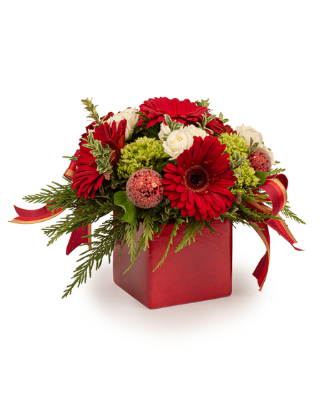 The Holiday Sparkle Centerpiece is a festive burst or rich Christmas colour and cheerful seasonal texture. Designed with flowers placed all around the arrangement ,it offers beauty from every angle - meaning the display photo only captures part of its full, vibrant look. Featuring bold red gerberas, creamy white roses, bright green hydrangea accents, sparkling red ornaments, lush evergreens, and a festive red-and-gold ribbon, this centerpiece brings classic holiday charm to any table or space. Fresh, full, and brimming with seasonal joy, it's a perfect way to brighten the home through the Christmas season.
