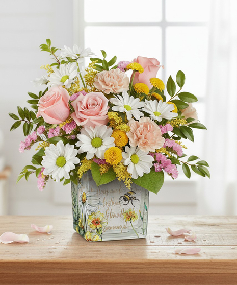 Bright and cheerful, the Honey Kissed Bouquet is a delightful blend of soft peach carnations, yellow button-spray chrysanthemums, white daisy-spray chrysanthemums, and pink sonata statice. Accented with solidago, huckleberry, and lemon leaf for added texture, this charming arrangement is presented in a vintage-inspired glass cube featuring enchanting garden imagery. A perfect way to bring warmth and joy to any space, this keepsake bouquet is sure to make hearts flutter.