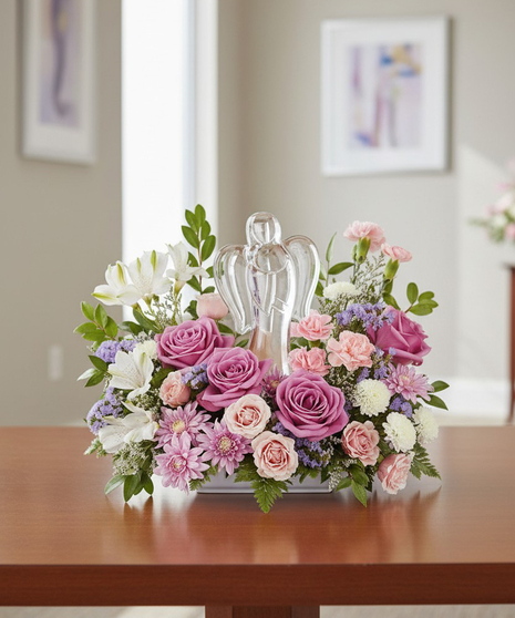 This arrangement features lavender roses, light pink alstroemeria, pink mini carnations, white button spray chrysanthemums, lavender cushion mums, lavender statice, and limonium, accented with lush huckleberry and leatherleaf fern. Finished with a beautiful crystal angel keepsake, this bouquet provides a lasting tribute and a meaningful expression of sympathy.