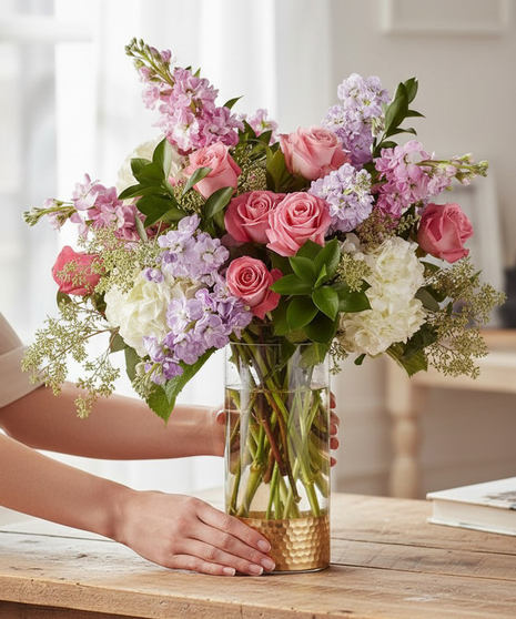 Take a walk in the gardens with this refined bouquet. Composed of an abundance of pastel florals and elegant texture in one of our signature designer vases, this arrangement brings natural beauty to anywhere it's placed. Featuring pink roses, white hydrangeas, lavender stock, pink stock, ruscus and seeded eucalyptus.