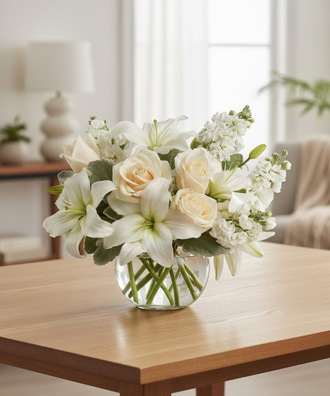 This lovely bouquet delivers an oasis of beauty and elegance that's both soothing, serene and very special. Cream roses, white Asiatic lilies and fragrant stock stems are arranged perfectly in a glass bubble vase. When it comes to special bouquets, our Isle of White is absolutely the right way to do white.