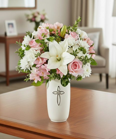 The Kindly Devoted Bouquet is a heartfelt expression of sympathy and support. Soft pink roses and alstroemeria blend beautifully with white carnations and lilies, creating a soothing and elegant tribute. Arranged in a white ceramic vase adorned with a silver-tone cross, this bouquet offers comfort and peace, honouring the memory of a loved one with grace and love.