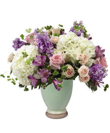 Send your condolences with a beautiful sympathy arrangement that includes hydrangea, spray roses, alstroemeria and stock. The combination of soft pink, peach, purple and light green colours is lovely. Each gorgeous flower in our Love and Peace Lavender Bouquet is complimented by an elegant vase to lift them up.