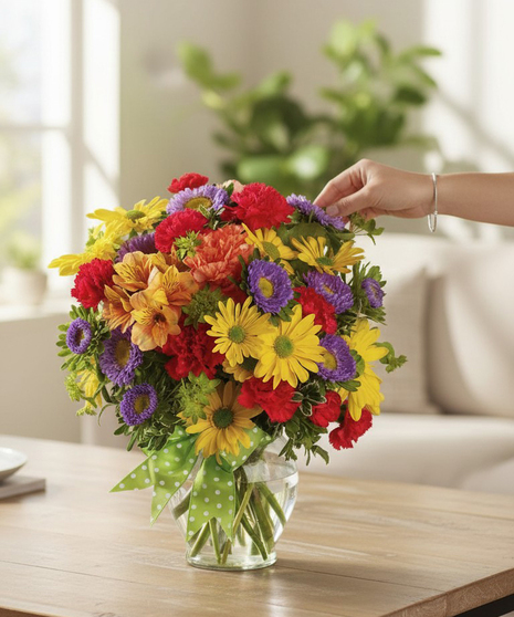 Celebrate any happy occasion with the Make a Wish Bouquet or simply send this bouquet to brighten their spirits. Colourful flowers include orange alstroemeria, yellow daisies, lavender matsumoto asters and miniature red carnations. Flowers are arranged with delicate green bupleurum and the vase is tied with a green ribbon.