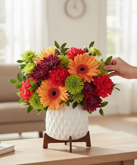 Two gorgeous gifts in one! Celebrate any happy occasion with this bouquet of bright blooms, stylishly presented in a mod mid-century ceramic planter keepsake! This bright bouquet features hot pink roses, peach gerberas, hot pink carnations, green cushion spray chrysanthemums, purple cushion spray chrysanthemums, and huckleberry. Delivered in a Mid Mod Geometric Planter.