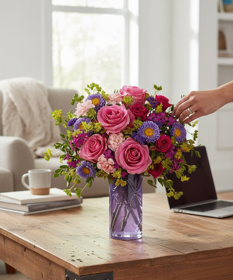 The Painted Petals Bouquet is a vibrant arrangement featuring a lively mix of pink and purple blooms designed in a soft lavender glass vase. Roses and spray roses are combined with carnations, asters, and textured filler flowers to create a rich and colourful display.