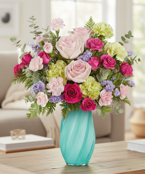 Fresh, vibrant and beautifully balanced, the Petal Tide Bouquet blends soft pinks with lively greens and subtle lavender accents for a bright, uplifting floral design. Light pink roses and hot pink spray roses are paired with green carnations, delicate pink miniature carnations, and airy lavender statice, finished with flowing eucalyptus and fern greenery. Arranged in a sculpted blue glass vase with an elegant diagonal swirl design, this arrangement makes a striking yet refined gift for any occasion.