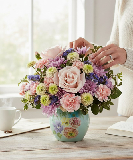 Arranged in a keepsake vase with a subtle floral design, this bouquet brings softness, colour, and timeless beauty to any space.