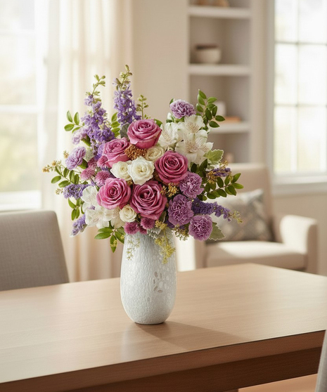 The combination of soft pinks, gentle lavenders, and creamy ivory tones creates a harmonious and elegant display. Accented with fresh greenery, this bouquet offers a natural, garden-inspired feel while maintaining a full and polished presentation.