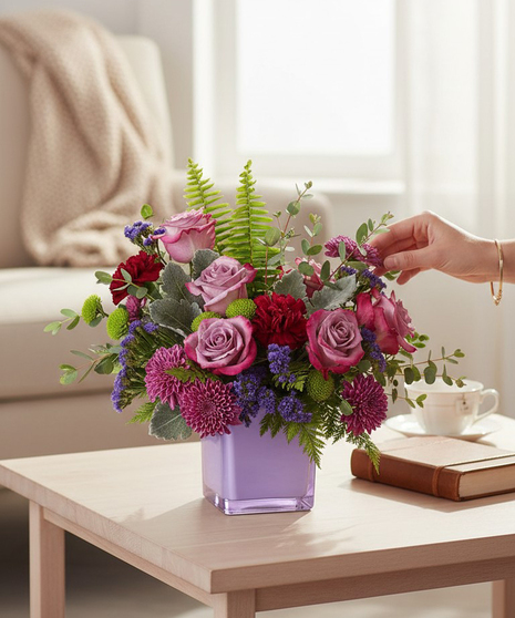 Soft and serene, this rich bouquet of lavender roses and moody maroon blooms is a touching gift any day of the week, especially presented in this stunning keepsake amethyst-coloured cube! Lavender roses, maroon carnations, purple cushion spray chrysanthemums, green button spray chrysanthemums, and purple sinuata statice are accented with sword fern, leatherleaf fern, dusty miller, and parvifolia eucalyptus.