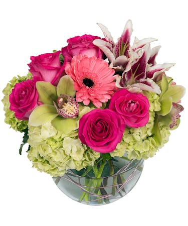 One dozen roses is a classic gift, but this beauty is a rare, unexpected treasure. A glass bowl with wire treatments is arranged with exotic green cymbidium orchids, lush hot pink roses, dramatic stargazer lilies, bountiful green hydrangea blooms and a pretty coral gerbera daisy. These are premium flowers and blooms expertly arranged in a gorgeous design that's ready to impress.