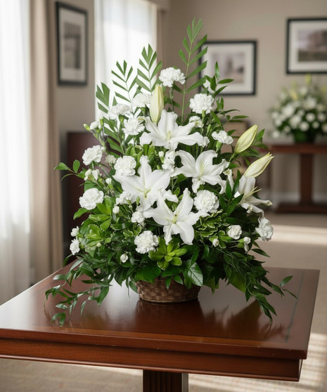 White flowers are always appropriate to send you heartfelt sympathy. This lovely arrangement of white lilies, carnations and miniature carnations is equally suited to send to the family residence, or to the visitation or service. Lovingly arranged with ample, assorted greenery, this one sided basket of blooms (best viewed from one side) sends a sincere message of peaceful rest.