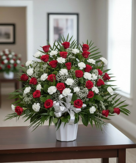 Red roses and white carnations are arranged in a matching container with greens and baby's breath. Choose 40 stems as shown, or a smaller version with 24 stems.