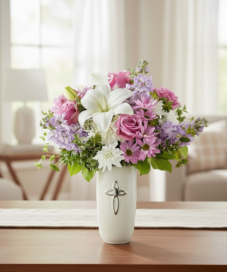 Express your heartfelt sympathy with the Sacred Space Bouquet. Arranged in a white ceramic vase adorned with a silver-tone cross, this elegant display offers comfort and peace during difficult times. Soft pink daisies and roses bled beautifully light purple stock and white lilies, creating a serene and uplifting tribute. A thoughtful gesture of love and support, this arrangement brings warmth and solace to those who need it most.