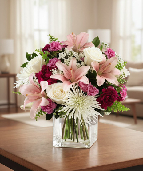 This bouquet is a sweet and blushing remembrance of the life and love of the deceased. White roses, pink Asiatic lilies, burgundy carnations, fuchsia mini carnations, white spider mums, Queen Anne's Lace and a variety of lush greens are gracefully arranged in a clear glass cube vase.